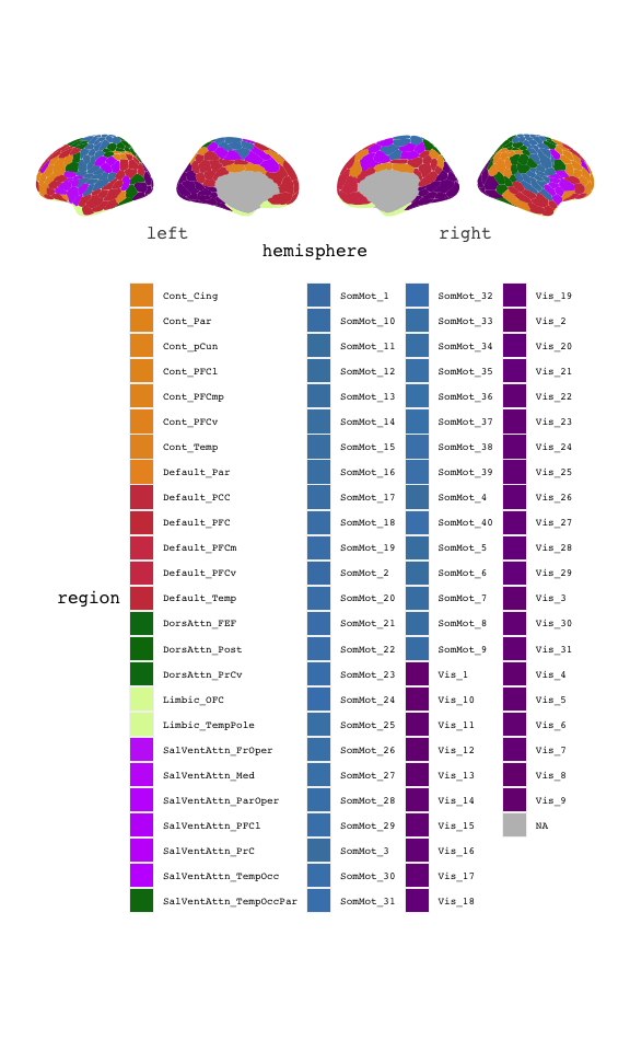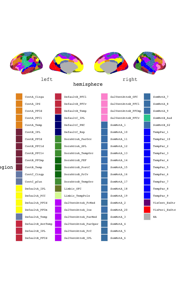 ggseg(atlas = schaefer17, mapping = aes(fill = region)) + scale_fill_brain("schaefer17", package = "ggsegSchaefer") + theme(legend.position = "bottom", legend.text = element_text(size = 7)) + guides(fill = guide_legend(ncol = 4))