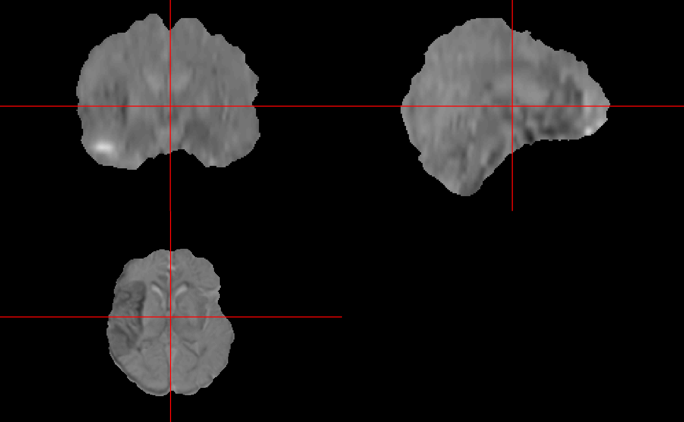 Now, we need to get the model fit for the regression, this fit is then used to create the list of prediction images for each subject. Then I used ortho2() to visualize the prediction image for the first subject.